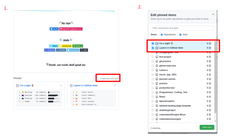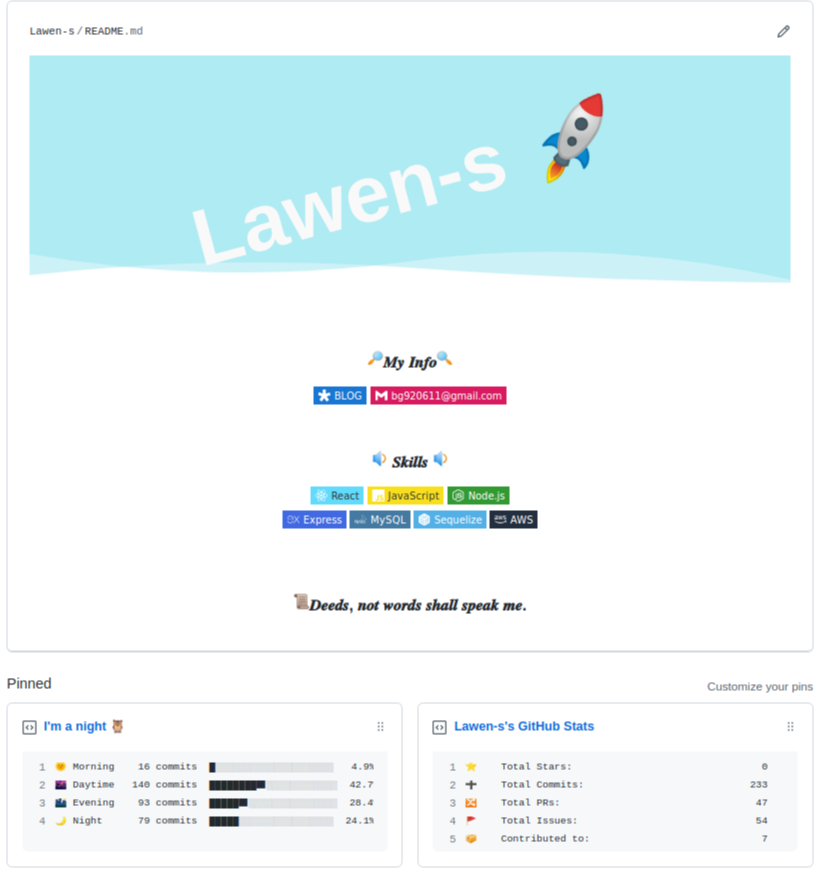 깃헙을 꾸미는 일은 자신의 스타일에 맞게 하는 것이라서 추후에 더 꾸밀 예정이지만 일단 이것으로 만족하려고 한다.