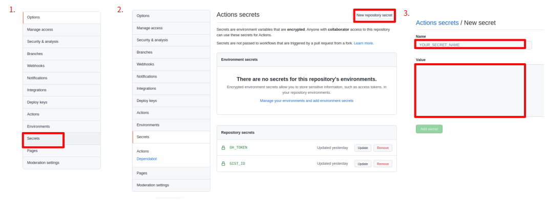 6. Settings 탭 > Secrets에 접속한 뒤 New repository secret 버튼을 클릭하여 환경변수를 설정해준다.
