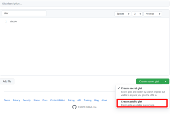 - gist.github.com에서 public으로 신규 gist를 생성한다. 제목과 내용은 아무렇게나 작성해도 된다.(추후 변경된다.)