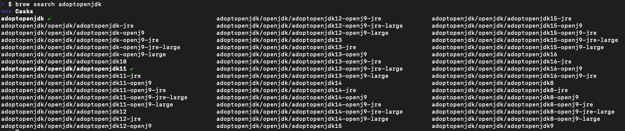 # brew search adoptopenjdk 입력하면 현재 설치된것들이 V 표시가 된걸 알수있다.