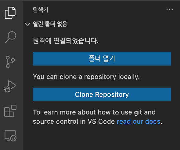 - 정상적으로 연결이 됐다면, 아무 문제가 없을 것이고 VS Code에 큰 특이사항이 없을 것이다.