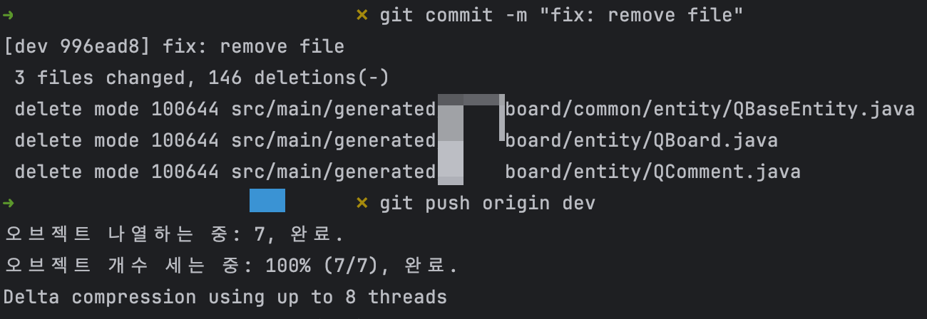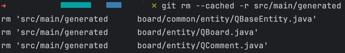 # 1. 특정 파일 제거 git rm --cache [파일명] # ex) git rm --cache src/main/generated/board/entity/QBoard.java # 2. 폴더 하위의 모든 파일 제거 git rm --cache -r [파일명] # ex) git rm --cache -r src/main/generated명령어를 입력하면