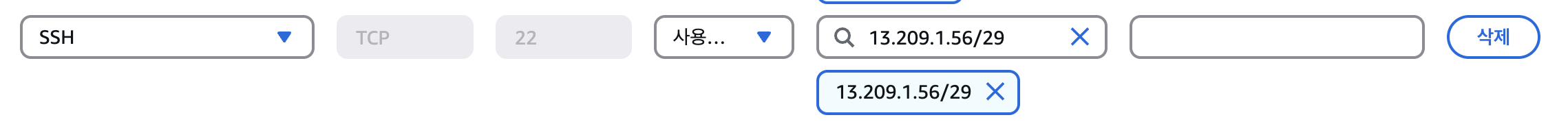 - 복사한 ip를 인스턴스의 보안그룹 인바운드 규칙에 추가해줘야 합니다. 추가할 때 유형은 SSH로 하시고 생성하셔야 합니다.