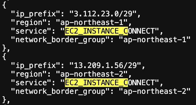 - ip-ranges.json을 클릭하면 리전별로 서비스의 내용을 확인할 수 있습니다. 저는 여기서 ap-northeast-2이면서 EC2 Instance Connect 서비스를 찾아야 합니다.