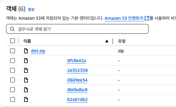- S3에 dist.zip 업로드 확인( 현재 다른 파일 5개가 있는데, 이건 Code Deploy에서 배포 시 자동으로 생성됩니다.)