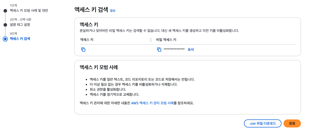 - 생성된 키의 csv 파일은 꼭 가지고 계시는 것을 추천합니다. 비밀 액세스 키는 csv파일로 다운로드하지 않는 이상 알 수 없기 때문입니다.
