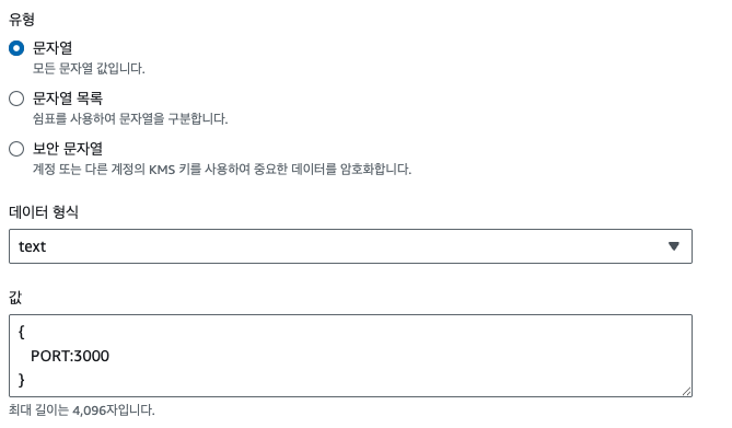 import { SSMClient, GetParameterCommand } from '@aws-sdk/client-ssm'; ..... config 설정 코드 ..... const ssmClient = new SSMClient({ region: 'ap-northeast-2', // credentials: { // accessKeyId: process.env.AWS_ACCESS_KEY_ID, // secretAccessKey: process.env.AWS_SECRET_ACCESS_KEY, // }, }); const command = new GetParameterCommand({ Name: '/test/param', WithDecryption: true, }); try { const response = await ssmClient.send(command); const envVars = JSON.parse(response.Parameter?.Value || '{}'); // envVars에 ssm에 저장된 값들이 할당됩니다. } catch (error) { console.error('SSM 파라미터 로드 실패:', error); }- credentials이 없으면 ssm을 가져올 수 없습니다. 로컬에서는 값을 지정해주셔야 합니다.