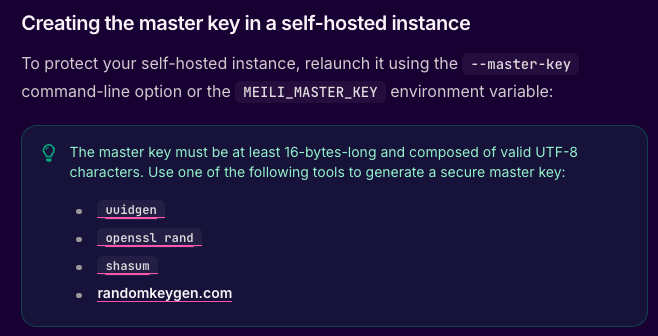 version: '3.1' services: ms: image: getmeili/meilisearch:v1.14 ports: - 7700:7700 environment: - MEILISEARCH_MASTER_KEY=MASTER_KEY command: ['meilisearch', '--master-key=MASTERKEY']2. MASTER_KEY는 MS를 사용하기 위해선 필수로 사용되는 키입니다. 키는 공식 문서에서 발급받는 방식을 알려주고 있습니다.