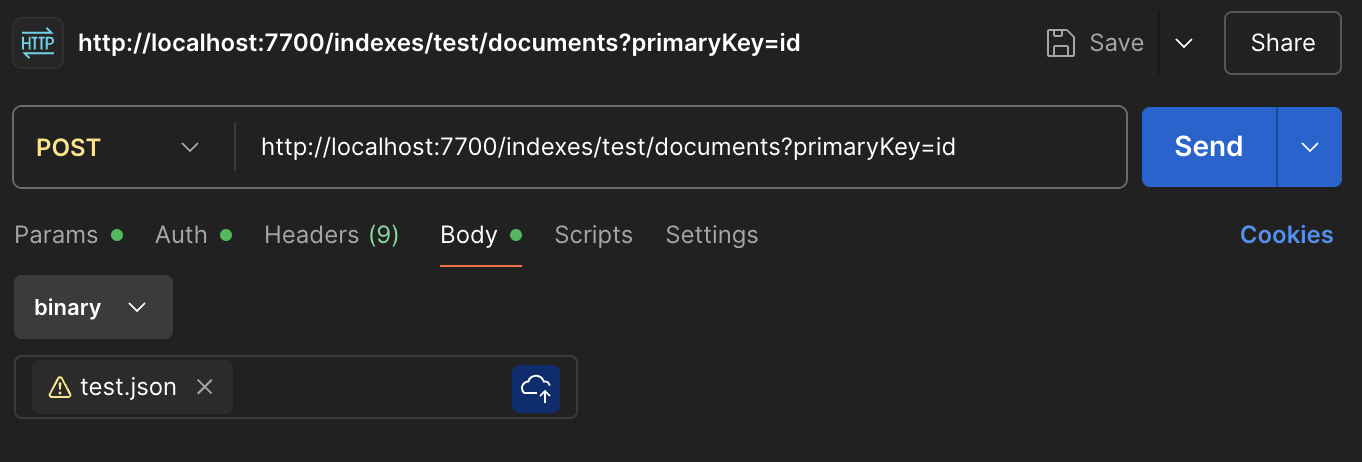 curl --location 'http://localhost:7700/indexes/test/documents?primaryKey=id' \ --header 'Content-Type: application/json' \ --header 'Authorization: Bearer MASTET_KEY' \ --data-binary 'test.json'