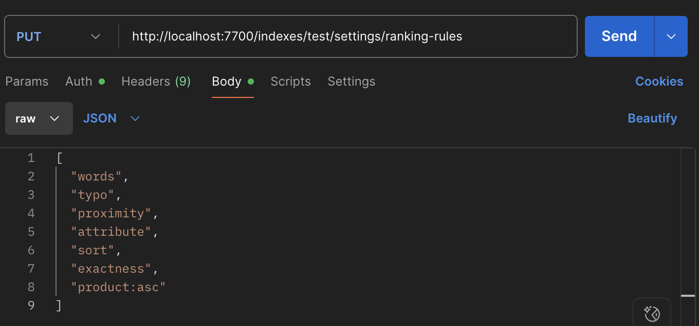 - 커스텀 순서 부여는 MS indexes 마다 Settings를 지정할 수 있는데 여기서 ranking-rules를 이용하여 지정할 수 있습니다.