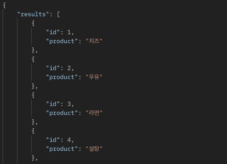 // test.json [ { "id": 1, "product": "치즈" }, { "id": 2, "product": "우유" }, { "id": 3, "product": "라면" }, { "id": 4, "product": "설탕" }, { "id": 5, "product": "김" } ]5. 준비된 json 파일을 기준으로 환경에 맞게 insert 하면 됩니다.