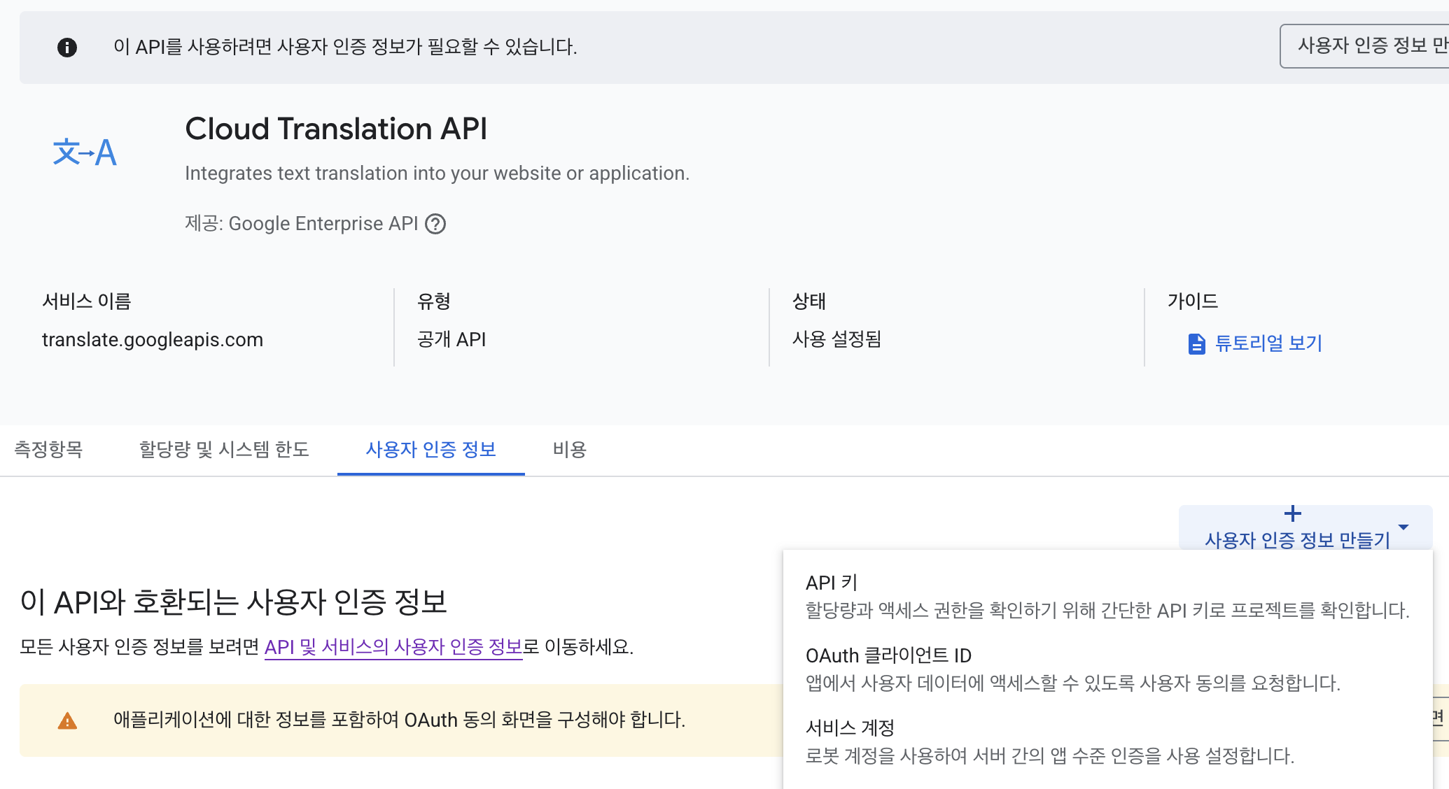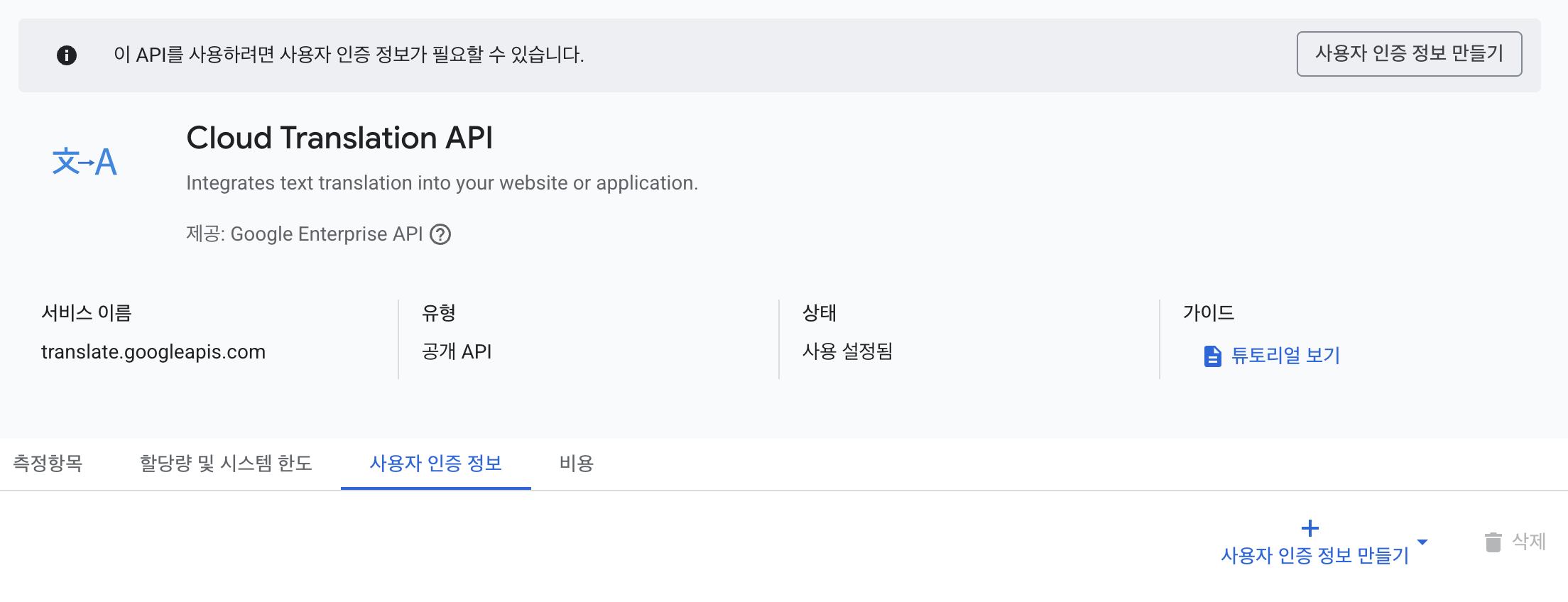 - 이미지에서 보다시피 사용자 인증 정보 만들기 버튼을 클릭하면 사용자 인증 정보를 만들 수 있습니다.