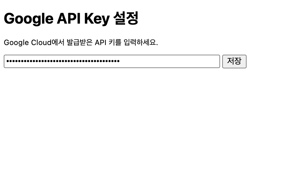 - Google API Key 설정 창에 발급받으신 API 키를 넣으시고 저장버튼을 눌러주시면 등록이 완료됩니다.